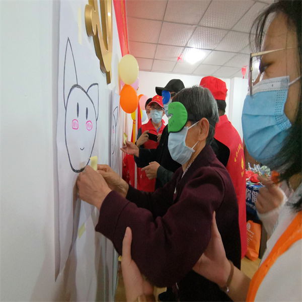 热身运动结束后,开始了我们第一个游戏——“贴鼻子”,社工用眼罩给老人蒙上眼睛,协助老人原地转三圈,并指引老人将贴纸贴在白板上,最终完成一幅作品。旋转之后,老人完成的作品都充满了惊喜,连老人都会惊讶自己会完成这样的作品。最后会决出7位获胜者,并发放奖品。